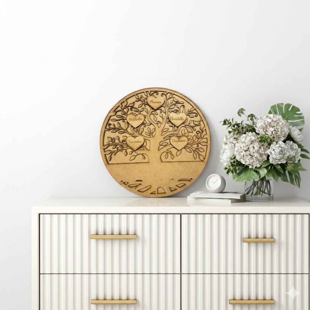 Dans cet arbre de vie en bois personnalisé, chaque prénom gravé devient une branche, un cœur, un souvenir qui prend place dans votre intérieur.