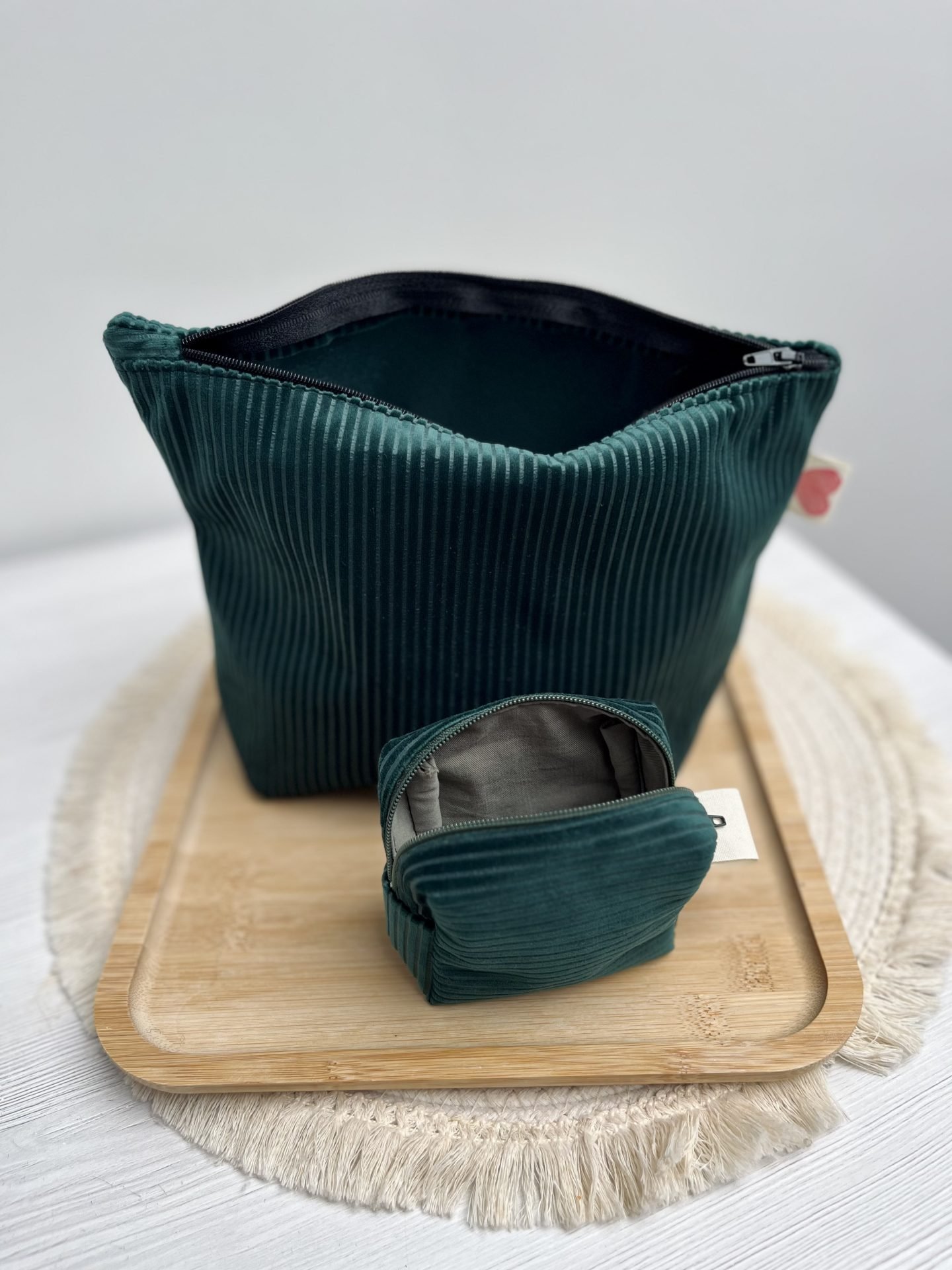 Une pochette/trousse souple en velours côtelé vert émeraude (non doublée), idéale pour le maquillage, les petits accessoires ou les indispensables du quotidien.