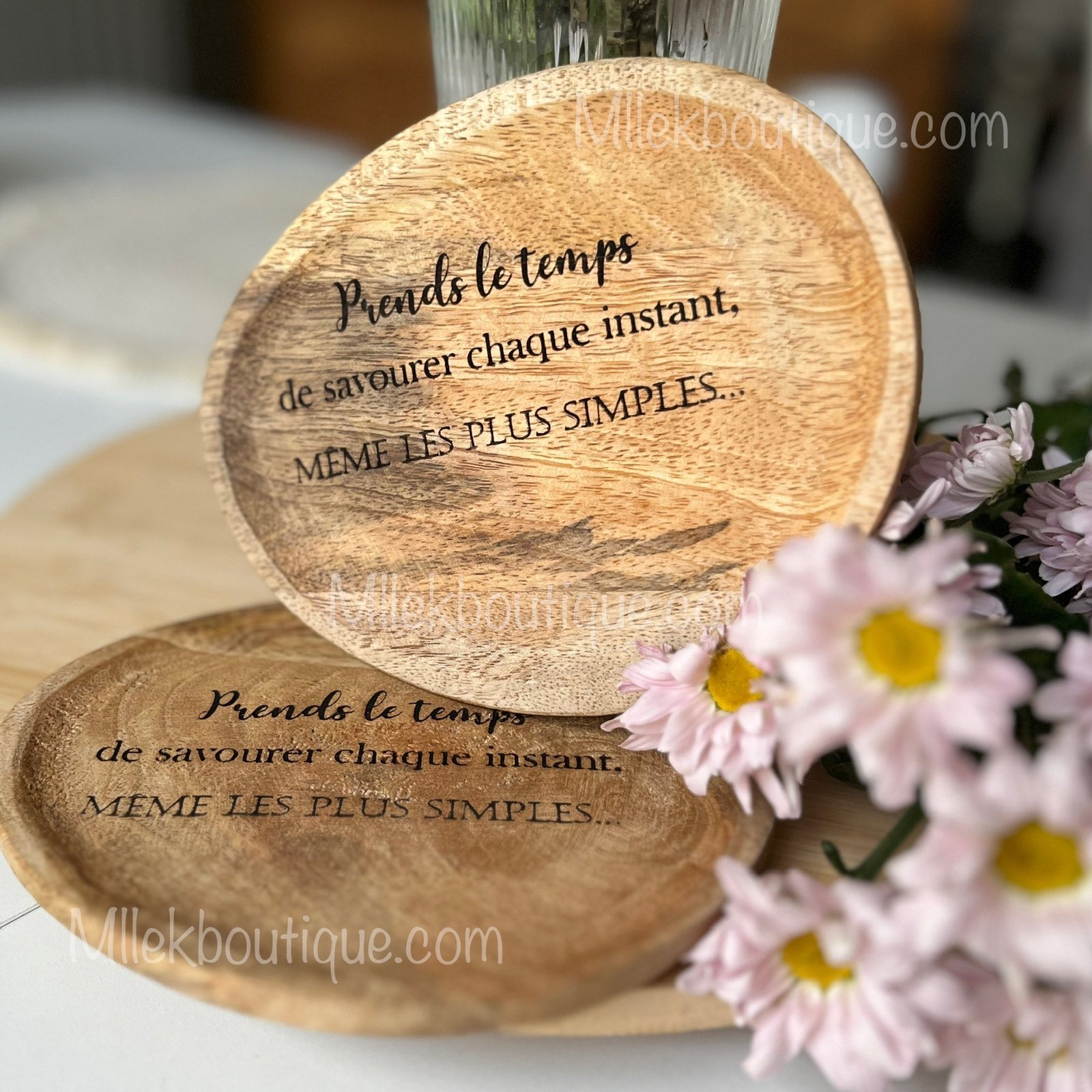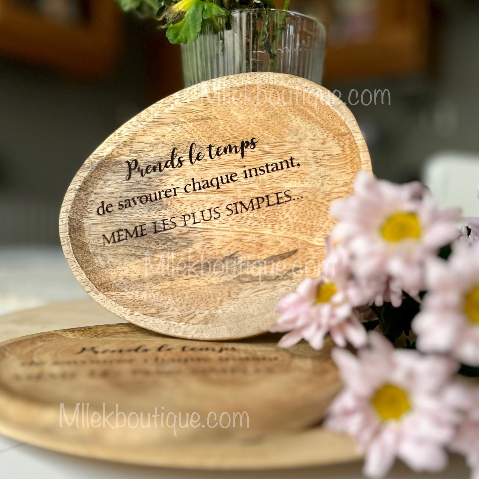 Son bois naturel, chaleureux, est délicatement gravé de la douce citation “Prends le temps de savourer chaque instant”, pour insuffler de la sérénité à votre quotidien.