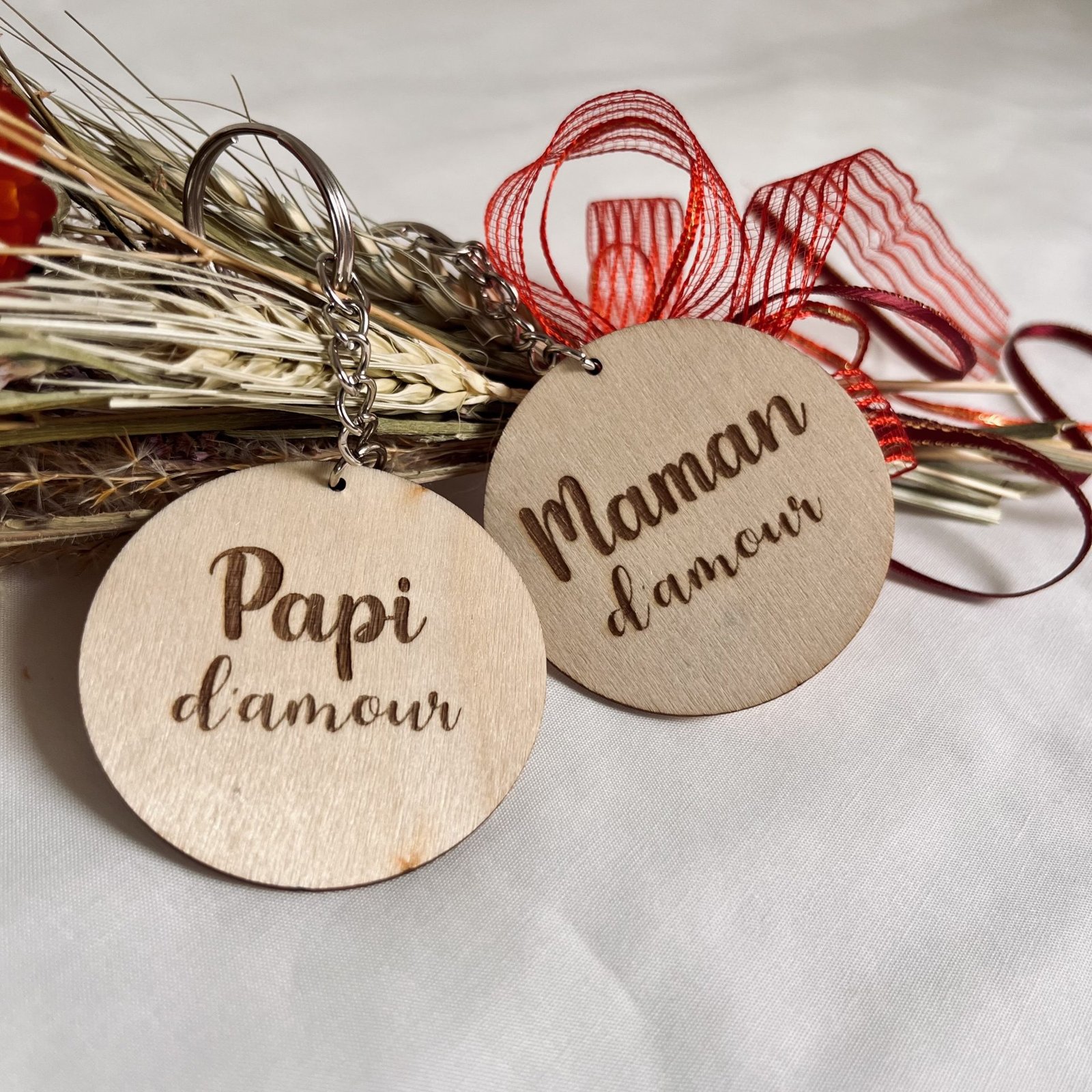 Porte-clés en bois gravé – Maman, Papa, Mamie & Papi d’amour 💖
